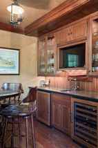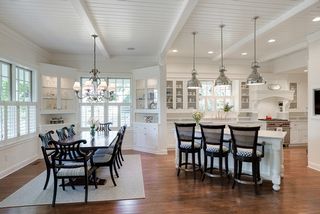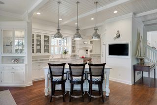 The multiple-width pine flooring flows throughout the main level. Overhead, the 10' ceilings are detailed with enameled tongue and grove + beam ceilings. While the plan is open in concept, the living room, dining room and kitchen each have distinct personalities.