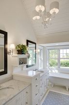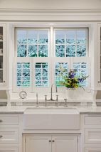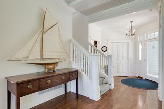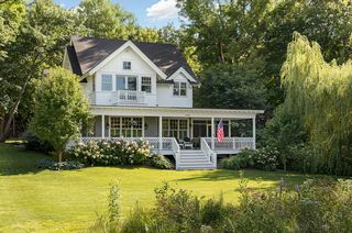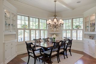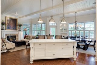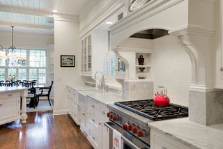 The living room centers around the brick hearth fireplace and two sets of French doors leading to the screen porch. Large windows and another door opens to the covered porch. The dining area has corner built-in cabinets for storage and display. The kitchen island sits at an angle to overlook both the living and dining areas and connects to the porch. Carrera marble countertops and Wolf range along with striking white cabinetry epitomize the blending of new to look classic.