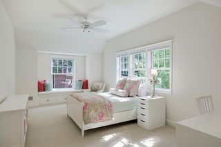 The office is flooded in natural light. A built in desk and book shelfs allow for plenty of space for seating or even a pull out sofa. Overlooking the beautiful landscaping and welcome approach at the front of the house are two large bedrooms complete oversized closets and built in window benches.
