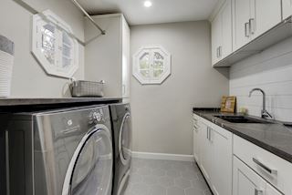 Three Upper Level Bedrooms Including The 30X15 Oversized Master Suite With Herringbone Marble Heated Tile Bath & Huge 30X15 Front Bedroom With 7X13 Walk In Closet. Beautiful Mud Room & Main Level Laundry With 250 SF Of 8” Hexagon Tile, Custom Built-In Seating Bench With Chevron Cushion, Designer Lighting, And Solid Brick Accent Wall. Convenient Main Level Laundry With Matching White Cabinets, Pietra Grey Honed Marble, and Grey Electrolux Front Load Washer Dryer Pair. Designer Ruvati Sink With Danze Faucet.