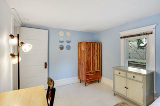 Main level has two living rooms, one bedroom/office, or dining room with five-panel french doors, and an eat-in kitchen with lovely new sink cabinets, and charming original cupboards.