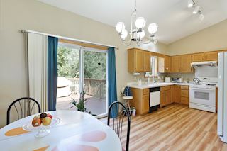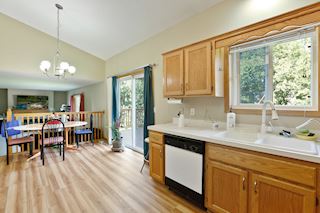 Kitchen features endless cabinets for awesome storage, new carefree flooring, plus sliding doors to large deck. Family room with marble-surround gas fireplace.
