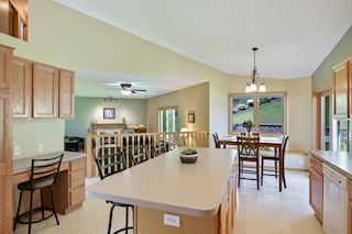 Wonderfully maintained modified two story home built by multi-award winning Biermann Homes. The open floor plan offers an oversized kitchen, a convenient 7 ft center island, tons of cabinet & counter space plus a handy built-in homework desk. Formal dining room, huge family room with a cozy gas fireplace and main floor bedroom & laundry. Three bedrooms on upper level where the master possesses a walk-in closet plus its own private bathroom. Lower levels holds a ton of sweat equity and could easily become a finished amusement room or another bedroom. The covered rear deck is perfect for grilling and relaxing and looks upon the professionally landscaped backyard with fire pit and amazing panoramic views. 3 garage stalls & shed for additional storage.Fresh paint throughout and new fixtures makes this home move-in ready!