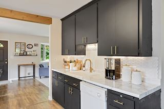 Gorgeous re-modeled kitchen has marble counters, honeycomb tile backsplash, stainless appliances, brass hardware.
