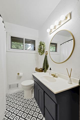 Gorgeous patterned ceramic tile plus walk-in shower and modern vanity in 3/4 lower level bath.