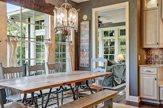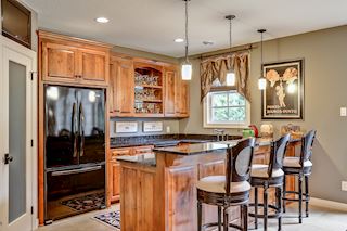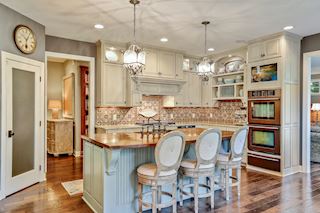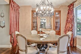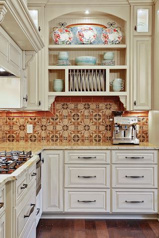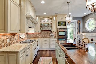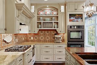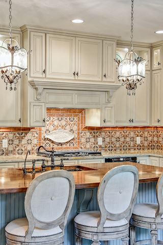 • KITCHEN: Wonderfully appointed kitchen with custom cabinets, oversized butcher-block island, perfect for entertaining, ample work space and storage throughout. Chef's kitchen complete with custom bronze finish fridge, double oven, and dishwasher. The glass-front display cabinets, under-cabinet lighting enhance this well-designed space. Walk-in floor to ceiling pantry, gorgeous granite countertops, hand-painted custom tile backsplash, informal dining options & more.