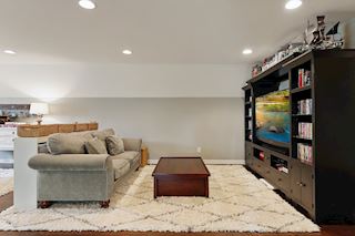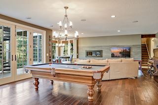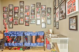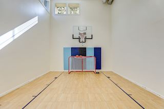 • SPORT COURT: Adjustable height basketball hoop and back board, gym mats that double as wall padding behind hoop, 19’ ceiling, interchangeable sport court tile flooring, water fountain and plenty of storage in the locker room across the hall. A great area for all to play!