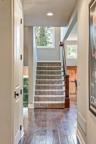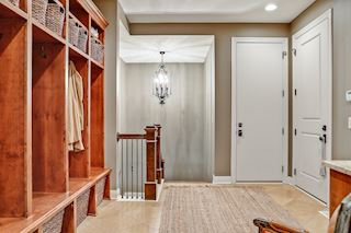 • BACK ENTRY: huge mudroom off garage with built-in drawers/counter, large custom cubbies, coat closet, service door, and back stairwell to lower level sport court entrance.