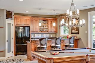 • BAR: Walk behind bar with wine room. Gorgeous mirrored open shelving. Bar has full fridge, sink, dishwasher, microwave and prep space.