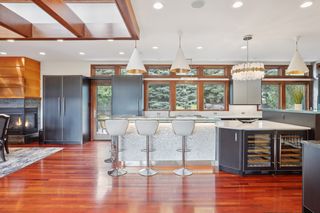 Situated on a large, private lot in the envious Whistling Valley neighborhood, this incredibly unique, prairie-style home displays rare architectural details you won’t find elsewhere. Gorgeous water and landscape features that include two firepots at the entrance are just the start of the grand highlights as you make your way down a long corridor lined with limestone columns and inside to breathtaking spaces. Stand in awe of light-filled rooms that feature vaulted and beamed ceilings, gleaming Brazilian cherry hardwood floors, and limestone piers and walls. The entire home is surrounded by walls of windows that lend serene views of nature and Goose Lake, and in the great room, a floor-to-ceiling, limestone fireplace is a statement piece shared with the master bedroom on the opposite side. Also fall in love with the remarkably renovated kitchen filled with lavish selections of tile, lighting, cabinetry, and countertops, not to mention a stunning wet bar to fulfill your entertaining needs. In addition, a spacious dining area showcases a floor-to-ceiling, tile and copper surround fireplace, along with two adjacent office spaces with beautiful built-in workstations. And located in its own private wing is the deluxe Owner’s suite with separate outdoor access to a tranquil, covered patio; and unwind the day in the dazzling en suite that has been completely remodeled with subway tiled walls, a marble surround shower, freestanding tub, and double vanity- all with top-of-the line fixtures. Plus, a favorable dressing room fulfills all your storage needs with its extensive organization system and offers convenient access to a dedicated laundry room. Other main level conveniences include a handy mudroom with a sink station and tons of storage, a walk-in pantry, remarkable half bath with custom designed walls and vanity, and an elevator that takes you to the lower level that’s full of desired amenities. Enjoy more of those limestone wall features that lead to a cozy family room with a granite surround fireplace, two luxurious bedroom suites with spa-like baths, a Finnish sauna, wet bar, and second laundry room. This wonder of a home is everything you could ask for and more.