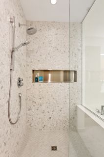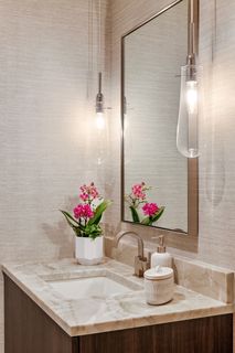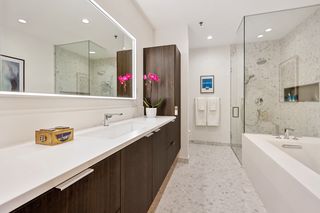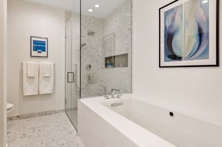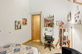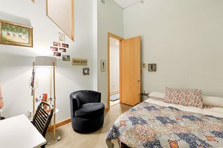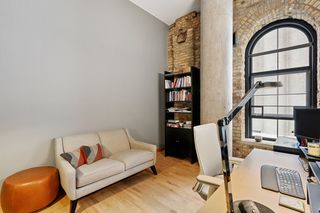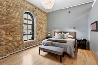 A spacious foyer leads to the third bedroom or home office, powder room, and stairwell to the lower level. A meandering staircase to the lower level leads down around an enclosure with satin etched glass interior skylights that bring light into the second bedroom below. As you arrive in the lower level hall the second bedroom with expansive walk-in closet and guest bath align as you culminate at the end with the primary suite. Arched windows, views of the Gold Medal Ruins, peak-a-book views of the Stone Arch Bridge from your bed, historic brick, and 12-foot ceilings create a one-of-a-kind environment. The primary bedroom has a spacious private den and a large walk-in closet. A stunning primary bath renovation was recently completed with Ann Sacks Terrazzo Renata floors, Cambria and Corian surfaces, and carbon-stained custom cabinetry.