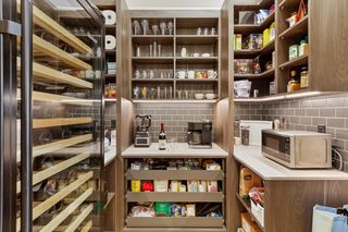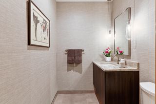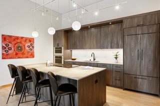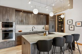 A two-sided fireplace sheathed in Moderno Porcelain brings textured visual sensation and strength while creating a focal point between the living and dining rooms. New bleached hardwood floors throughout the main level bring an airy and modern feel to the environment. The custom kitchen features carbon-stained cabinetry, Wolf and Sub-Zero appliances, a white glass backsplash, and Dekton counter surfaces. The combination of materials throughout conveys elegance, warmth, and modernity.