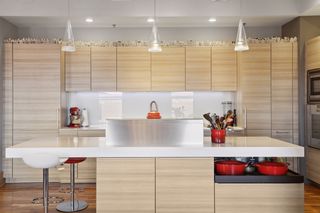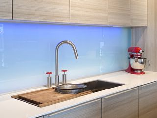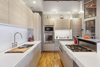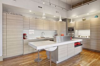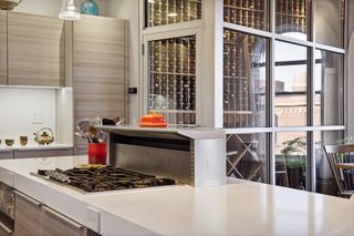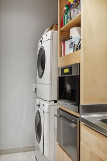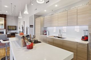The private entry flows beautifully into the open "Loft" style living room, dining room, kitchen and the show stopping floor to ceiling glass Wine Room. The sleek kitchen was designed with custom "Poggen Pohl" cabinets, 5 burner "Gaugenau" Gas cooktop +"Gaugenau" (separate) refrigerator & freezer. The backsplash lights up from behind and it can change colors. The semi hidden pantry is perfectly set up to hold an extra refrigerator, laundry, 2nd sink, coffee station and more storage.
