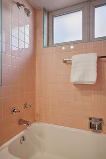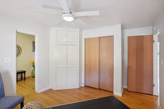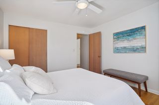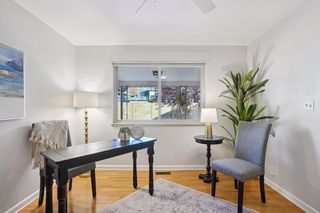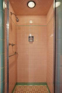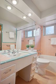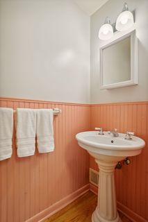 Three generously sized bedrooms are thoughtfully separated from the living area by a convenient pocket door. The retro-style full bath includes both a tub & a walk-in shower, while the updated powder room features wainscoting & a pedestal sink.