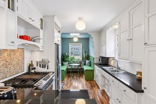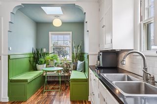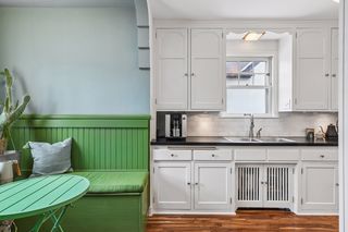 The main floor offers a cozy living room with a wood burning fireplace, an updated kitchen with a built in banquette, 2 bedrooms, and a full bath with the original tile and hardwood floors throughout.