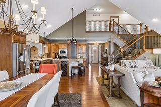 Designed for both everyday living and elevated entertaining, the main level features a luxurious primary suite with a spa-like bath and heated floors, a vaulted great room anchored by a fireplace, and a well-appointed gourmet kitchen with abundant cabinetry, prep space, and a walk-in pantry. Adjacent dining and gathering spaces are enhanced by custom built-ins and expansive windows that frame tranquil lake views while filling the home with natural light. The upper level offers generously sized bedrooms, well-designed bath layouts, a spacious bonus room, and a loft featuring built-in bookshelves and a window seat overlooking the lake—ideal for a reading nook, study area, or additional lounge space.