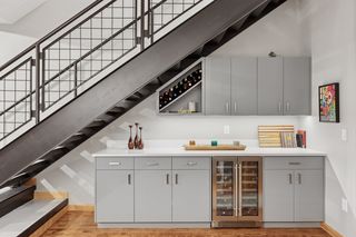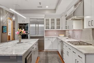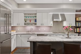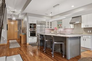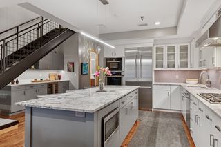 The expansive living and dining areas offer ideal spaces for entertaining or relaxing, featuring large windows and stylish finishes. Rich hardwood floors run throughout the main level, leading to a remodeled kitchen outfitted with high-end appliances and exquisite quartzite surfaces. A beautifully redesigned powder room adds charm and sophistication, while a cleverly integrated serving and bar area with abundant storage is tucked under the open staircase—maximizing both function and style.