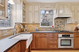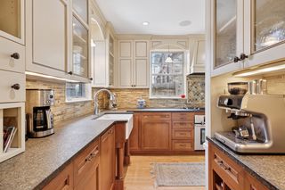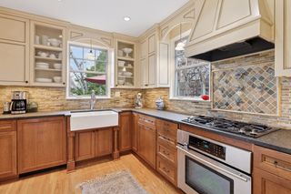 **Step inside and be captivated!** The heart of the home is an exquisite **remodeled kitchen**, showcasing custom cherrywood and vanilla cabinets, topped with antiqued granite countertops. Equipped with premium **Jenn-Air and Bosch appliances**, this kitchen is a chef's dream, complete with a charming farmhouse-style sink that overlooks your **picturesque backyard**. Whether you’re crafting a morning brew or pouring an evening glass of wine, the cozy coffee/wine bar nook is perfect for indulgence.