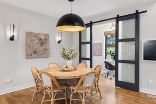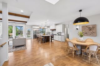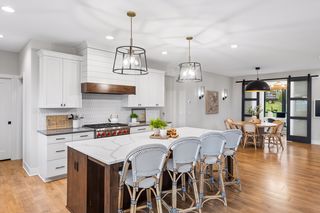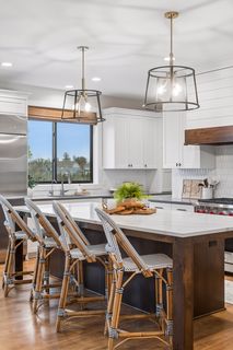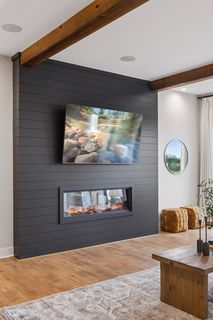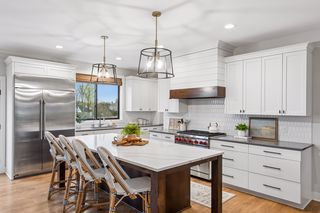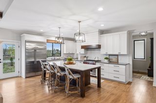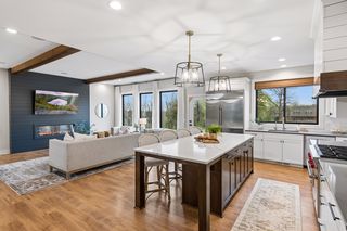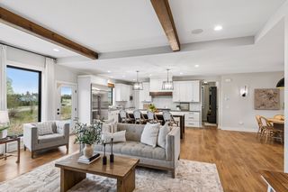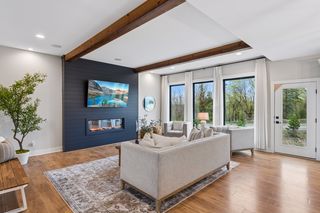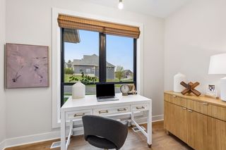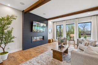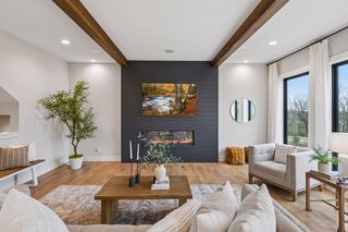 The gourmet kitchen is the centerpiece of the main level, featuring 48" built-in side-by-side Cafe refrigerator and Wolf gas range, abundant cabinetry, custom walk-in pantry and a spacious center island that flows seamlessly into the sun-drenched great room. Here, a stylish electric fireplace and designer lighting create a warm yet modern gathering space. Flexible main-level rooms offer versatility for a home office, study, or additional lounge area to fit your lifestyle.