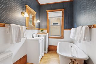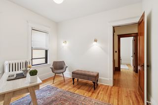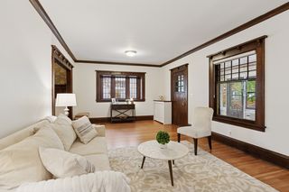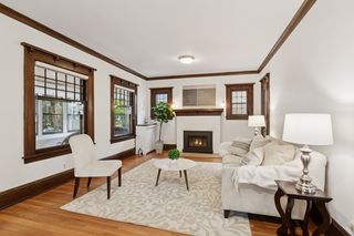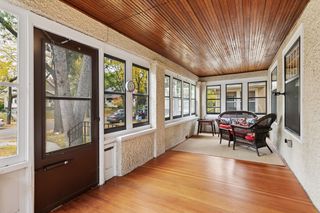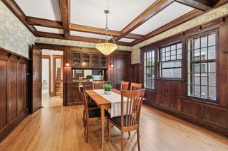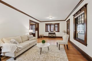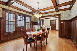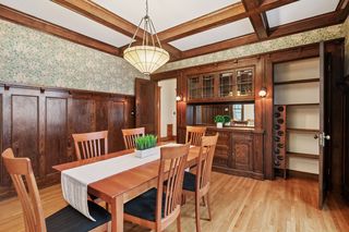 Welcome to this stunning King Field classic! This spacious home showcases exquisite craftsmanship, featuring rich woodwork throughout, paneled walls, and a boxed-beam ceiling in the dining room. The built-in buffet impresses with beveled glass backing and leaded-glass upper doors. Charming details abound, including mantel sconces above the gas-burning fireplace and decorative stained-glass fixtures in the dining room. The main level offers two bedrooms and a full bath, providing flexible options for use as guest rooms, a home office, or additional living space. Upstairs, you’ll find three bedrooms, two with large walk-in closets, and a spacious landing that offers additional flex space and a second full bath and a bonus room with a cedar closet is ideal for a craft room, office, or creative studio. Lower level features a rec space, workroom and laundry. Enjoy relaxing on the large front porch with updated windows and beautiful fir floors, or unwind on the back deck overlooking the vibrant flower garden. With no alley and a private driveway, this home offers exceptional privacy.Perfectly situated on a wonderful block of Wentworth Avenue, this home is just a short walk to shops, restaurants, and the lake—offering the ideal blend of classic charm, comfort, and convenience.