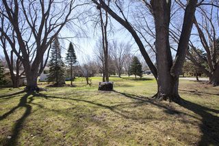 The backyard consists of sprawling tracts of green grass and mature trees.