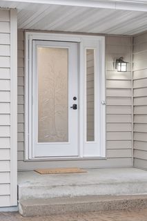 The open-concept kitchen is the heart of the home, featuring a center island, stainless steel appliances, crisp white cabinetry, and elegant granite countertops — ideal for both everyday living and entertaining. Step outside to a maintenance-free deck or the stamped concrete patio and enjoy peaceful woodland views in the backyard, with scenic park views from the front.