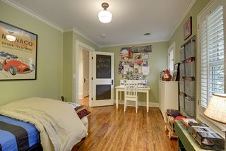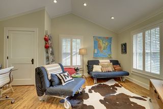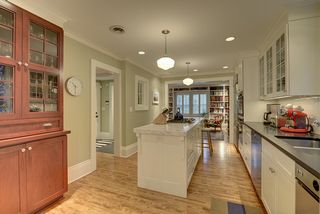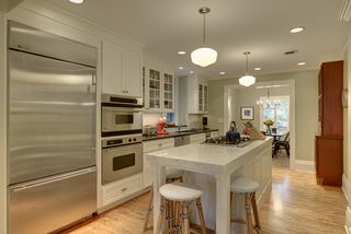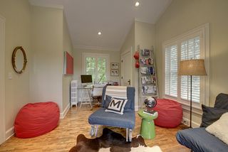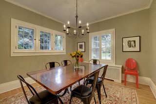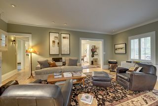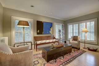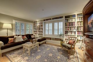 Main floor features a bright sunroom, living room with wood burning fireplace, a formal dining room, gourmet stainless kitchen with high end appliances and marble center island, and a powder room. A family room adjacent to the kitchen with garden views, plantation shutters, and a beautiful built in bookcase offers an inviting main floor gathering space.