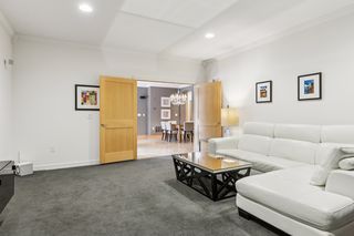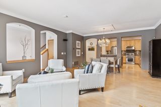 The open-concept main level features a spacious living room with a cozy fireplace, a dining area, and a sleek modern kitchen equipped with stainless steel appliances, granite countertops, a custom-tiled backsplash, and a large walk-in pantry. Perfect for entertaining, the main floor also includes a generous family room complete with a 70” TV, a premium Bose surround sound system, and a convenient powder room.
