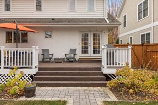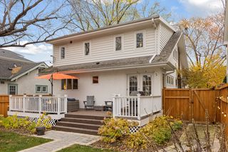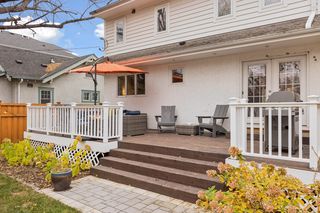 As you enter the front door you have original oak wood floors, a large open concept well equipped kitchen with the added bonus of a dining table which is giving major cute cottage vibes (this table can also be switched out for a substantial built in island. This main level is rounded out with a cozy living space lined with windows, a formal dining space that leads out to the rear patio and powder room.