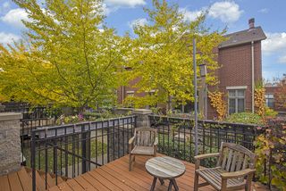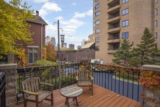 The main level includes an open living and dining floor plan, a gas fireplace with mantel surrounded by built-in bookshelves, a bay window looking out upon a tree lined courtyard, and a large private deck facing the courtyard, a center island kitchen, closet, and powder room.