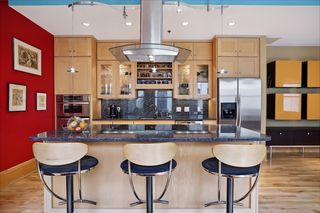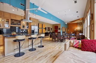 Start on the 7th Floor to enter the inviting main level with soaring ceilings and a full wall of oversized windows. This open living space allows you to create and design the perfect living area for you. Presently it is used for living, dining, kitchen and extra nooks for a piano and a cozy sitting area, along with a half bath, laundry, and lots of storage. The kitchen features an awesome “Induction” cooktop and an overhead exhaust hood fan, granite counters with an island breakfast bar, stainless appliances, solid maple cabinets and there is a gas line available if you wish to switch to a gas cooktop.
