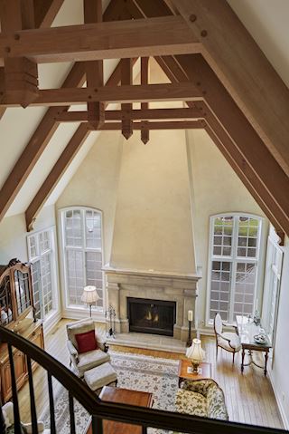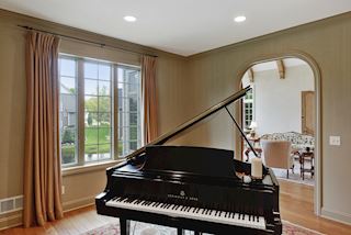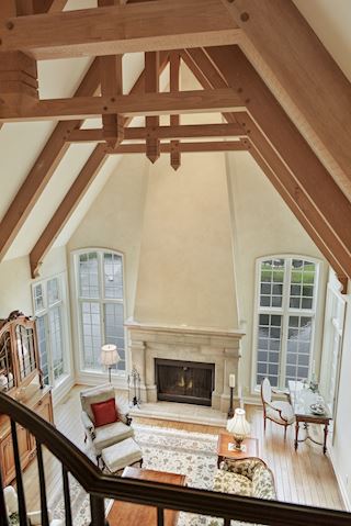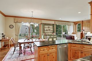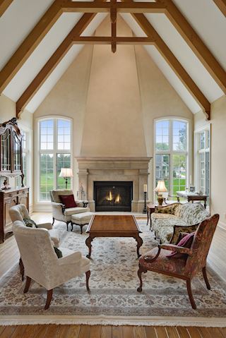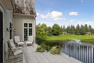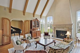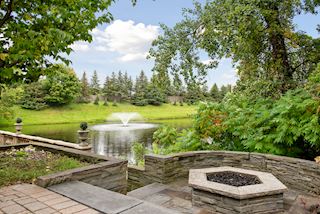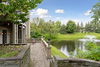 This thoughtful main level living design offers a rustic elegant dining room and a grand great room showcasing a gorgeous wood beam vaulted ceiling, walls of windows, hardwood floors and wood-burning limestone fireplace. The music room would also make a perfect den or office. The first floor Master Suite offers a spacious retreat with spa-like private bath, his & her vanities, separate commode, whirlpool bath, spacious tiled shower and walk-in closets. In the heart of this fabulous home, you'll find a gourmet eat-in kitchen with cozy hearth area and access to the deck overlooking the meticulously maintained landscaped yard, fountain, paver stone patio and beautiful pond views.