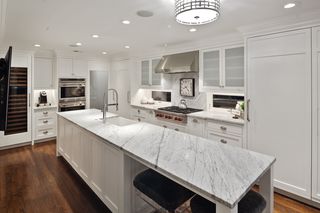 Charming front porch opens up a grand foyer and staircase. Sitting room off the entry with wood burning fireplace. Hardwood floors reach across the main level. Gourmet kitchen featuring top of the line stainless appliances; Sub Zero refrigerator and freezer, wine fridge, double ovens and Wolf gas range. Statement center island, marble counters and eat-in breakfast area. Formal dining room, powder room and family room.