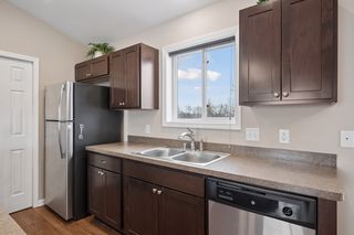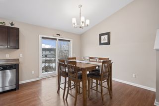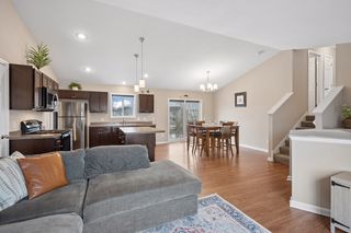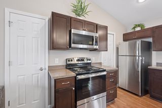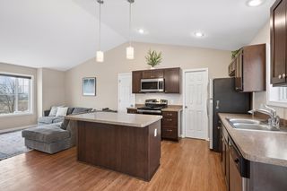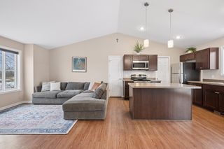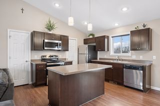 Step inside and the main living space opens immediately under soaring vaulted ceilings, connecting a generous living room to a well-appointed kitchen featuring a center island, rich espresso cabinetry, low-maintenance flooring, and a full stainless steel appliance package: range, microwave, dishwasher, and fridge all included. It's a turn-the-key-and-start-living situation.