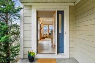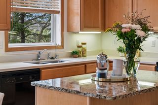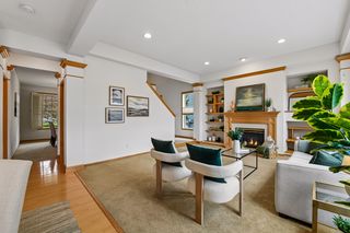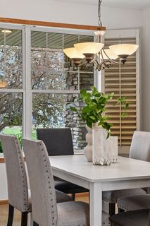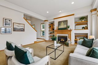 Step inside to a stunning first impression—your gaze is immediately drawn to the tranquil water view. The living room is anchored by a gas fireplace with a maple mantel, complemented by built-in bookcases and surround-sound wiring. The kitchen showcases maple cabinetry, a granite-topped center island, and a sunlit eat-in area, flowing seamlessly to the formal dining room accented by custom wood shutters. Upstairs, three bedrooms and two bathrooms include a vaulted primary suite with a private en-suite bath and walk-in closet. In an additional bedroom, a built-in desk and shelving with custom shades create a refined home office.