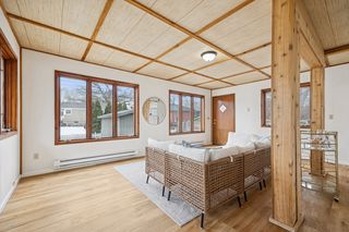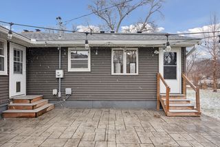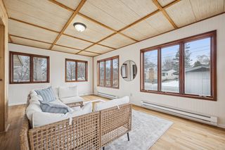 The generous kitchen and combined dining room easily accommodate a large dining table, making everyday meals and gatherings a breeze. Flexible spaces throughout the home include a mudroom/office space, a bright four-season room addition, and two cozy fireplaces. The finished lower level offers a spacious second living area with a comfortable family room, spacious bedroom, and a beautifully updated bathroom with a walk-in shower. A large laundry room with abundant storage adds everyday functionality. Outside, enjoy a large stamped-concrete patio perfect for relaxing or entertaining, plus a sizable backyard shed for additional storage.