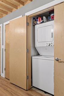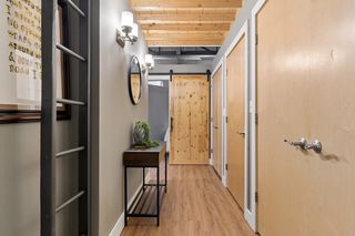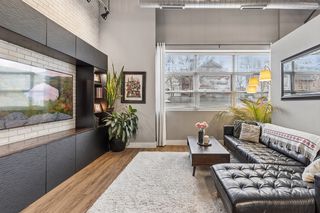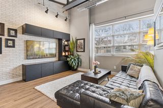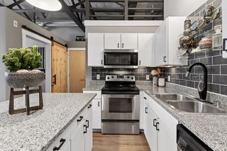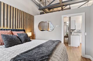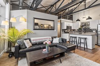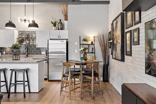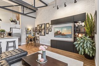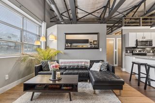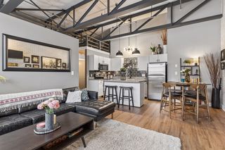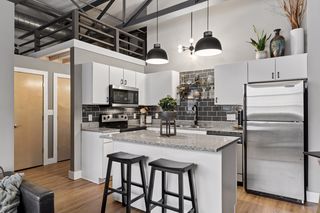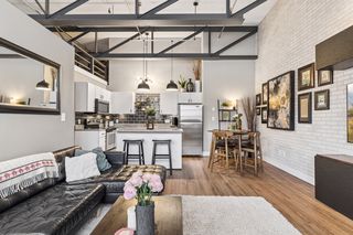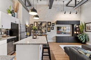 Stylish true loft in the historic Franklin Lofts featuring soaring ceilings, oversized windows, and exposed brick and ductwork for an authentic urban feel. This bright and open layout offers a spacious kitchen with ample cabinetry and center island, flowing seamlessly into the living and dining areas—perfect for entertaining or everyday living.