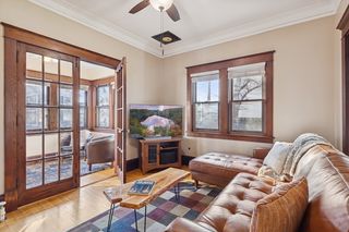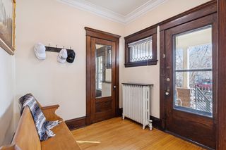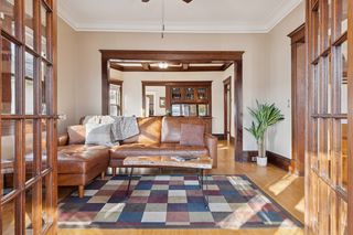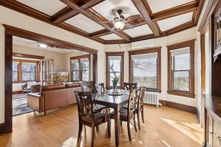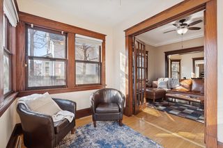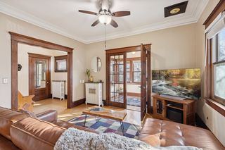 Beautiful Oak millwork and hardwood floors throughout most of the home. Living room opens through double french doors to sun-filled front porch. Classic dining room with elegant boxed beamed ceilings, built-in buffet, & floor to ceiling bay window. Modern, updated kitchen has a delightful walk-in butler's pantry. Four bedrooms, 2 full bathrooms plus an kitchenette and living space upstairs allow for separate living for friends or family. Basement has high ceilings and egress window primed for expansion. New roof , updated siding and exterior trim give you little to worry about. Lovely privacy fenced back yard provides a great spot to relax.