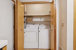 Easy-care laminate flooring extends throughout the main level for continuity. A half wall bridges the space between the dining room and kitchen, and features counter seating with pendant lighting. Sit here to enjoy your morning coffee or casual meals-on-the-go. The well designed kitchen boasts abundant cabinetry and expanses of sensible workspace, making meal-prep a joy! There is access to the garage for bringing in the groceries, and a step-saving “hidden” laundry with washer, dryer and storage shelves for your wash-day needs.