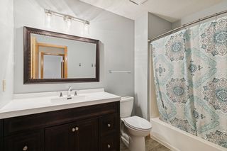 Travel to the upper level to find two well-proportioned bedrooms, each with ceiling fans, soft-on-your-feet neutral carpet and bright windows with treetop views. The owner’s bedroom has a generous walk-in closet plus a double closet. The bedrooms share a full bath with large vanity, laminate flooring, and an adjacent linen closet in the hall.