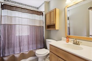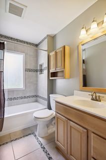 Main level full bath with ceramic tile floor and tub surround.