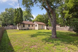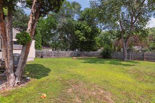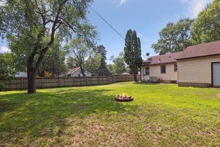 Large backyard with privacy wood fencing, firepit, and storage shed.