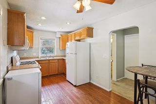 Kitchen/dinette features hardwood floors, glass tile backsplash, gas range, double sink with garbage disposal, recessed lighting, and ceiling fan.