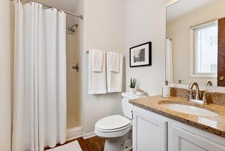 The well-designed kitchen features sleek white cabinetry, expanses of sensible workspace with new countertops, and new stainless steel appliances. A half wall joins both the living room and the dining room with the kitchen for an open and airy feel, making it a breeze to visit with the cook. Continue down the hall to find three convenient closets, one designed as a pantry, one as a coat closet, and one as a linen closet. Don’t miss the in-unit laundry with washer and dryer!