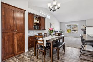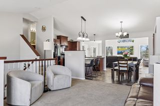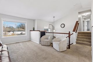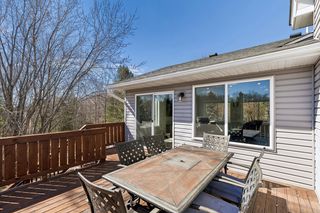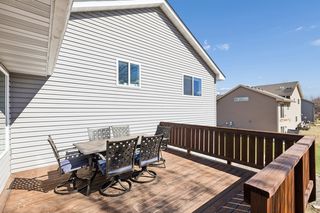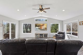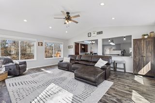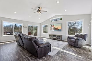 The layout flows effortlessly into the dining area and living room, making entertaining a breeze. The spacious great room is bathed in natural light thanks to oversized windows and sliding glass doors that open directly to the rear deck — perfect for enjoying Minnesota's warmer months. Vaulted ceilings and a ceiling fan with recessed lighting complete the space.