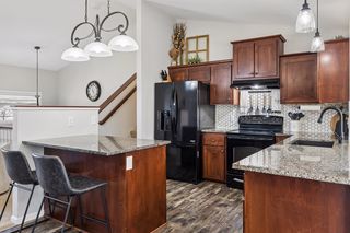 Inside, the open-concept main level immediately impresses with vaulted ceilings, gorgeous finishes, and an abundance of natural light pouring in through large windows on every side. The chef-inspired kitchen is a true standout featuring rich cherry cabinetry, stunning granite countertops, a hexagonal tile backsplash, black appliances, and a center island with bar seating.
