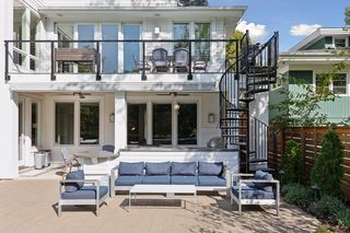 The open main level showcases new white oak flooring, an updated kitchen with quartz countertops, new appliances, and a stylish tile backsplash — all framed by floor-to-ceiling windows that capture the ever-changing creekside scenery. Step outside to a newly rebuilt deck with a striking spiral staircase leading down to the outdoor oasis below.