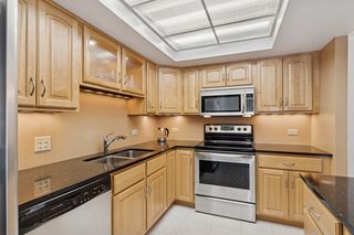 The kitchen shines with stainless steel appliances, granite countertops, abundant cabinet space, custom under-cabinet lighting, and a center island with bar seating. Two spacious bedrooms and in-unit laundry with full-size washer and dryer complete the layout. The primary suite offers a private bath, large vanity, linen closet, and two additional closets—one that’s a walk-in. The second bedroom includes direct access to the balcony.
