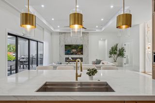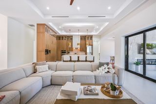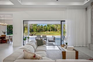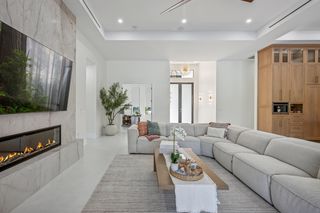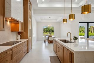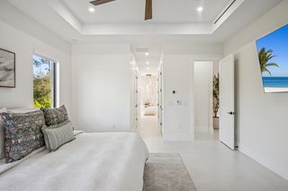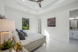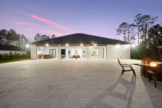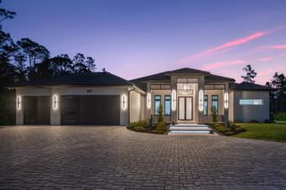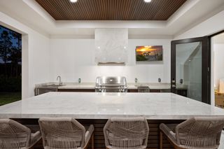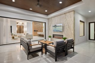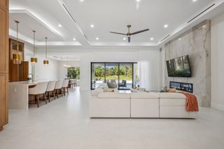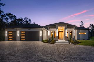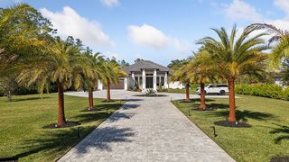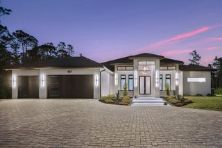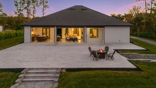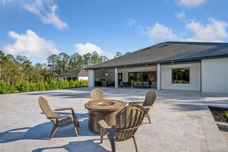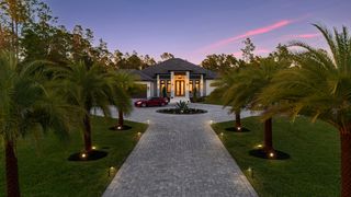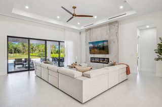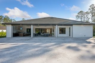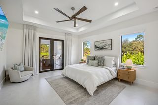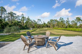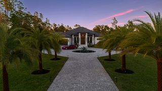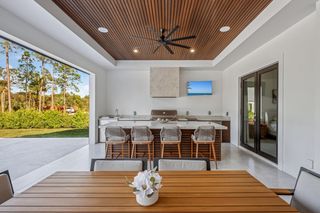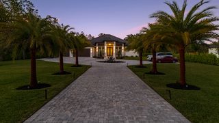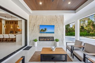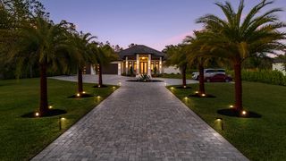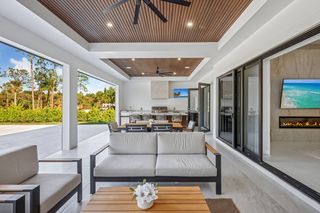 This home is designed for seamless indoor-outdoor living. Complemented by Level 5 drywall finishes and Sonos speakers throughout for added luxury. The expansive lanai features a full outdoor kitchen and bar, electric fireplace and automatic roll-down screens. The backyard is highlighted by 2,615 square feet of paved decking and a soccer field with sprinklered Zoysia grass. Two wells, one for the house and one for irrigation, provide efficiency, and a 500-gallon reverse osmosis system ensures pristine water quality. Thoughtful exterior details include Christmas outlets throughout the soffit, outlets surrounding Sylvester palms for ambient lighting, and pre-wiring for a front gate. Motion-sensor lighting on the shell stone floating steps as you approach the front entry.
