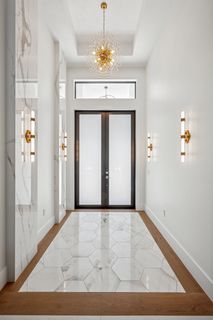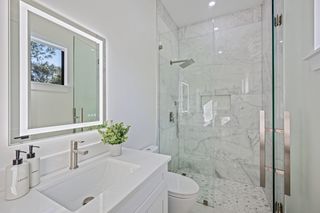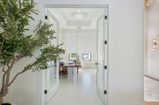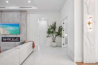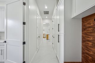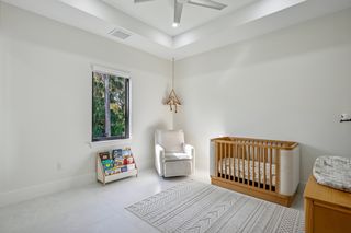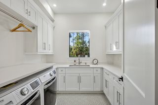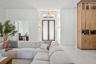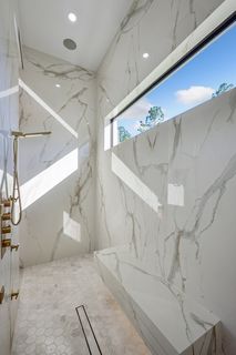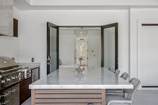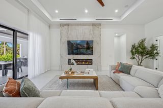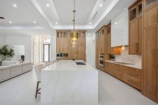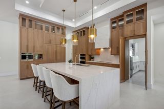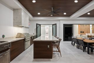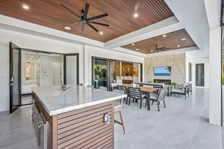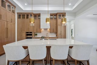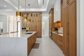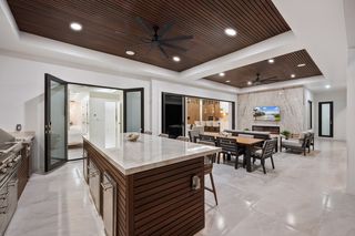 The kitchen is a true masterpiece, boasting Jennair panel-ready appliances, custom white oak cabinetry and "floating" ceiling! A butler’s pantry, complete with a second refrigerator and wine fridge, adds convenience and style. The spacious primary suite is equally impressive with his and her walk-in closets and a spa-like bathroom! Walk-around shower with multiple shower heads and bench, dual sinks, abundant cabinetry and Toto toilet. Home office with french doors just off the master suite. Split-bedroom layout with 2 additional bedrooms on the other side of the house both with attached full baths. An impressive 28 full slabs of quartz, quartzite, and porcelain used throughout the home! 13' ceiling in the living room with cozy electric fireplace and whole-wall pocket sliding doors that, when opened, offer a sensational panoramic view of the backyard.